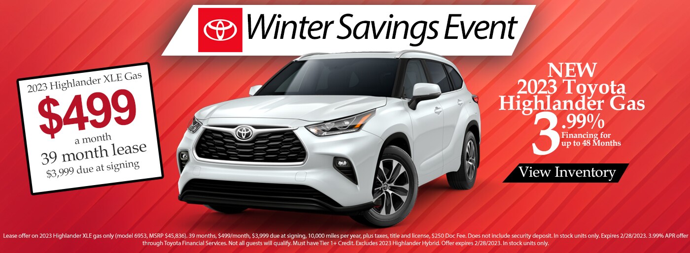 Ā Lease offer on 2023 Highlander XLE gas only (model 6953, MSRP $45,836). 39 months, $499/month, $3,999 due at signing, 10,000 miles per year, plus taxes, title and license, $250 Doc Fee. Does not include security deposit. In stock units only. Expires 2/28/2023. 3.99% APR offer through Toyota Financial Services. Not all guests will qualify. Must have Tier 1+ Credit. Excludes 2023 Highlander Hybrid. Offer expires 2/28/2023. In stock units only.