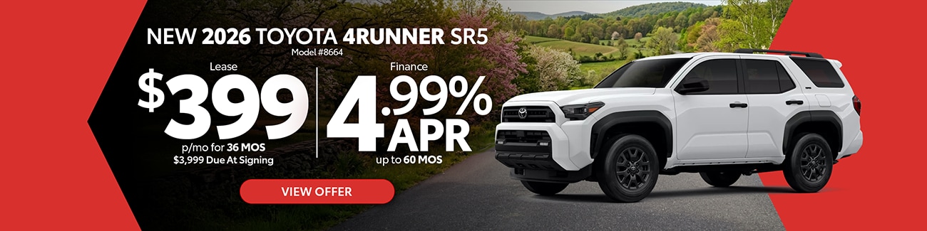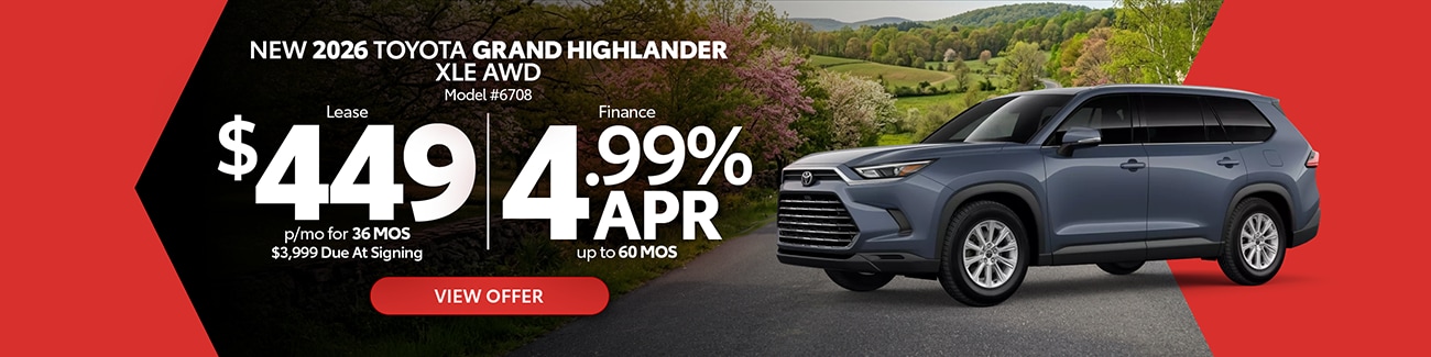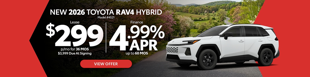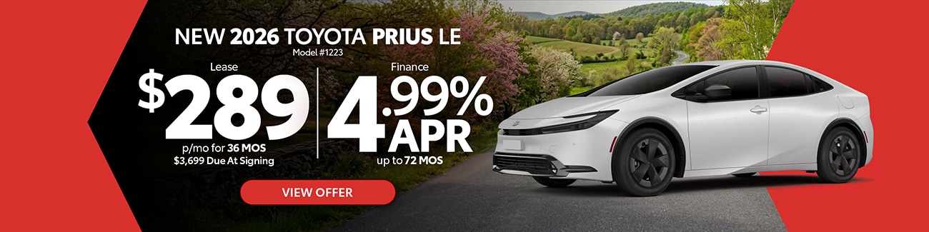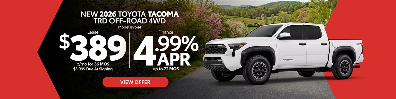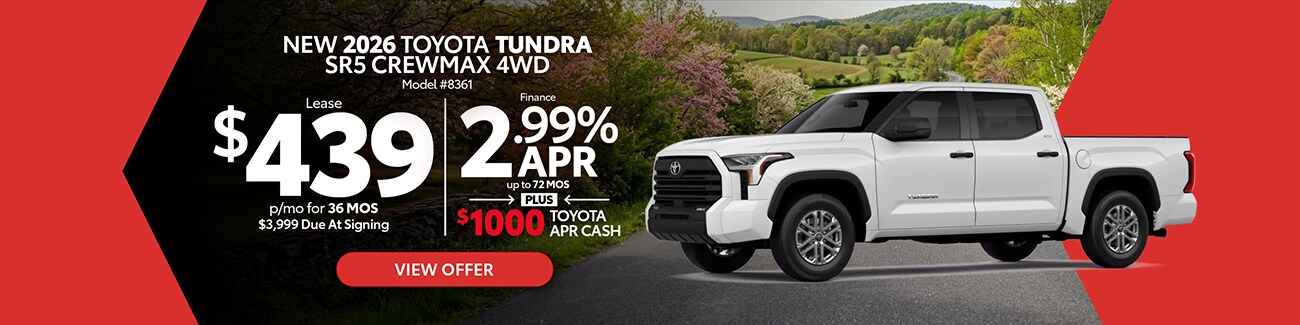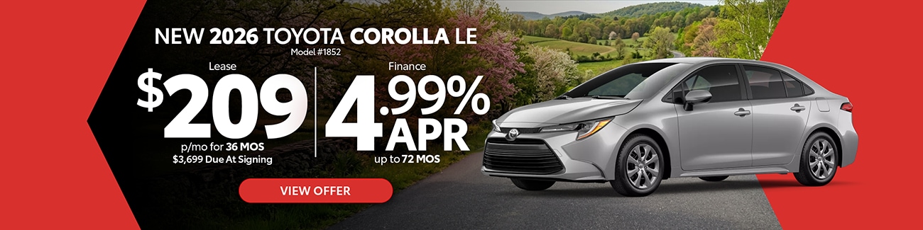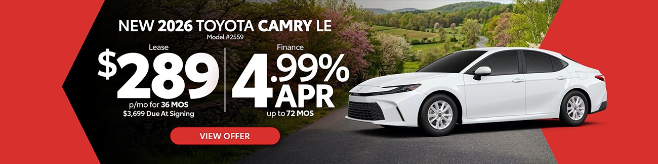 Explore the latest Toyota specials at Jim White Toyota in Toledo, OH, featuring current lease deals, low APR financing, and limited-time incentives across a wide range of new Toyota cars, trucks, and SUVs. Whether you're shopping our newest Corolla, Camry, RAV4, Tacoma, Tundra, or other popular Toyota models, you'll find diverse offers designed to fit your budget and lifestyle. Browse available inventory online, compare model offers, and take advantage of specials before they expire.
