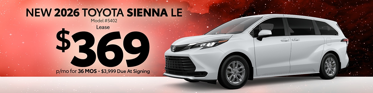 Prices include all costs to be paid by consumer except for licensing, registration, taxes, & $387 doc fee. 2026 Toyota Sienna LE (Model 5402) lease through Toyota Leasing Trust. Requires Tier 1+ Credit. Can not be combined with any other offer. $3,999 due at signing, $369/month, 10,000 miles per year, 36 months, plus acquisition fee and all other fees. Does not include security deposit. Not all guests will qualify. All offers expire 2/2/2026. See Jim White Toyota for complete details.